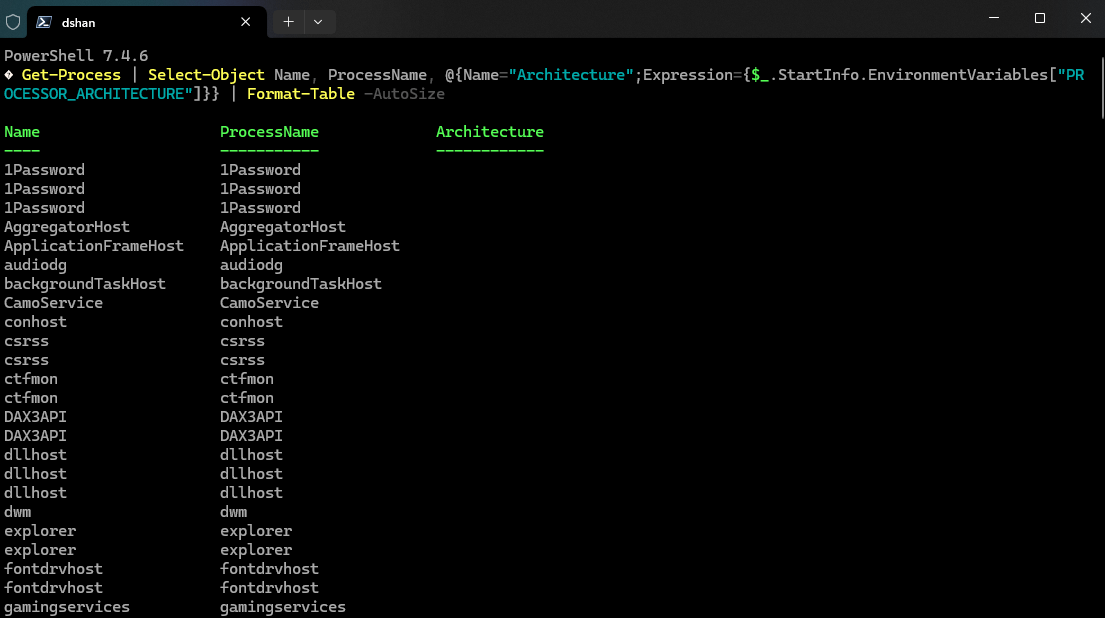 Get-Process | Select-Object Name, ProcessName, @{Name="Architecture";Expression={$_.StartInfo.EnvironmentVariables["PROCESSOR_ARCHITECTURE"]}} | Format-Table -AutoSize - Review the output. ARM64 processes will be listed with “ARM64” in the Architecture column.