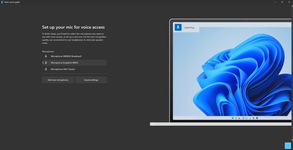 Choose the microphone you wish to use with Voice Access. If your desired microphone isn’t listed, select Add new microphone. You can also adjust sound settings if necessary. Click the arrow at the bottom left of the screen to advance to the next screen.