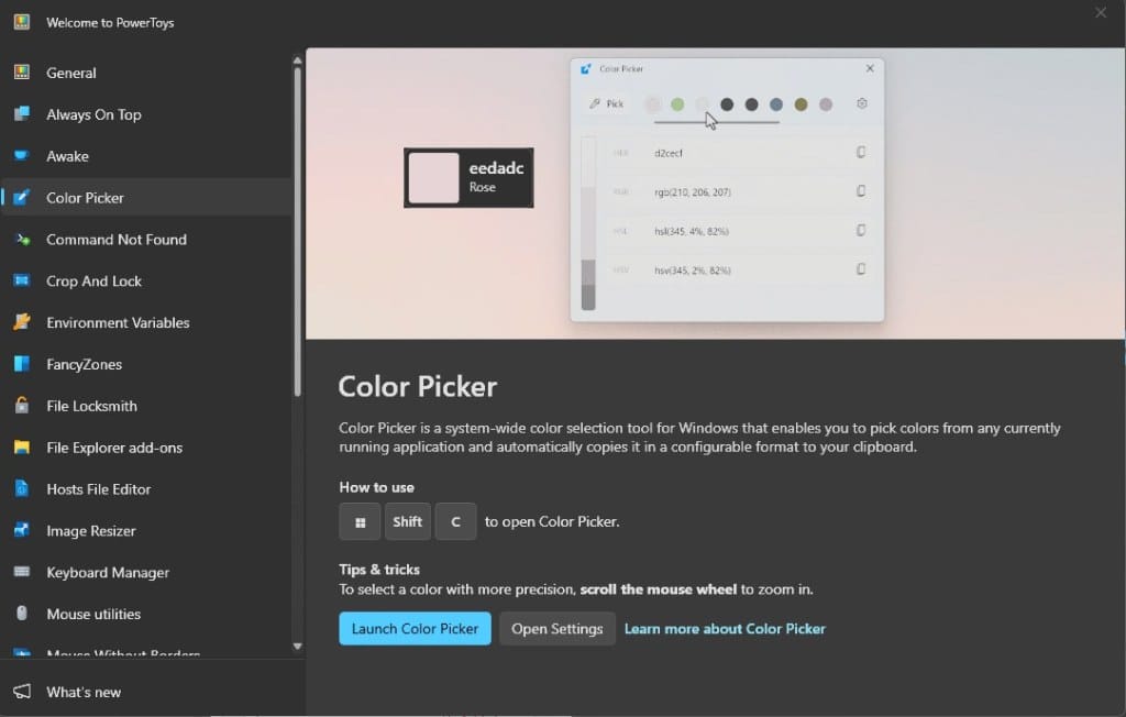 The Color Picker tool has been modernized with a Fluent UX design, aligning with Microsoft’s contemporary design language. This not only improves the visual appeal of the tool but also enhances the user interface for a more intuitive experience.