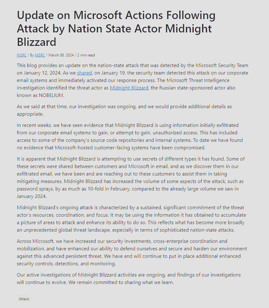 The disclosure from Microsoft reveals that Midnight Blizzard is utilizing information initially exfiltrated from the company’s corporate email systems in an attempt to access or gain unauthorized entry. This includes some of Microsoft’s source code repositories and internal systems, raising alarms about the potential for further exploitation and attacks. Check out Microsoft’s full statement below.